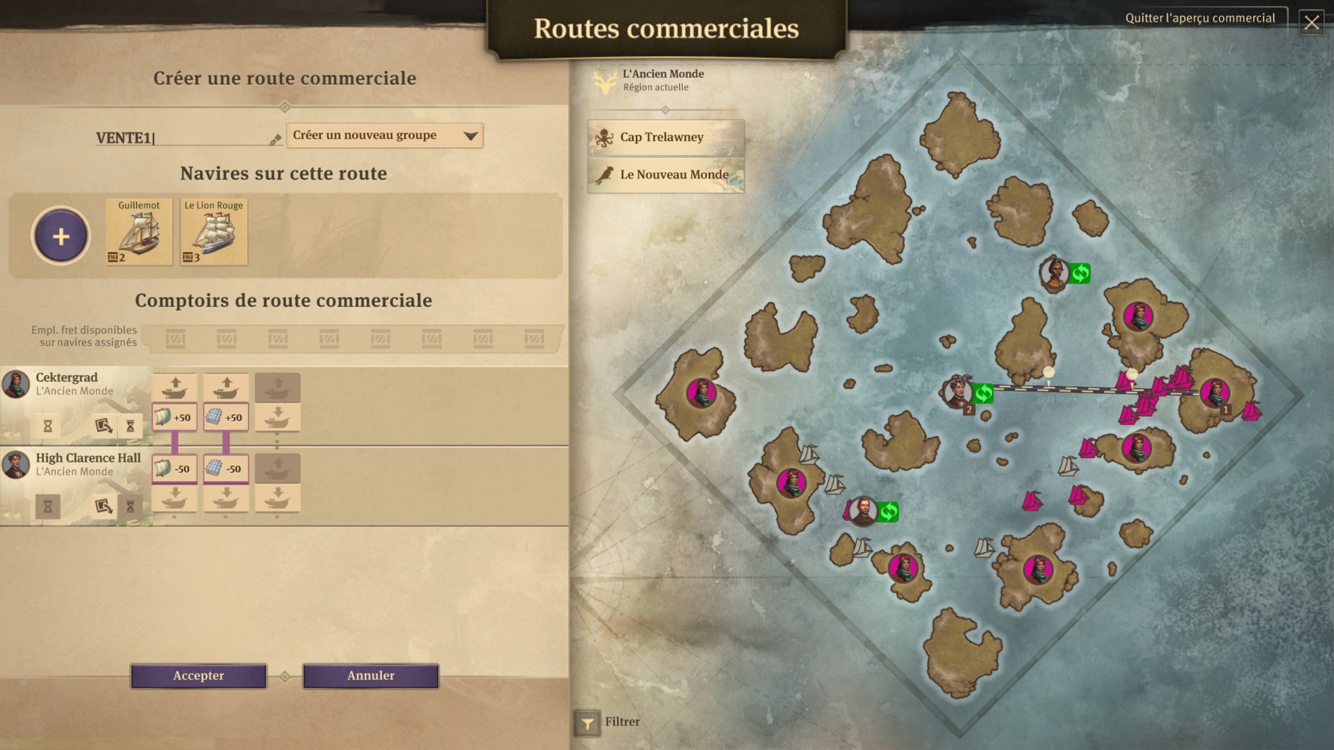 Voyez toujours plus grand que le besoin initial. Une goélette n’a que deux emplacements de ressources. Je vous recommande de ne transiter qu’une ressource par route, et d’allouer ces deux emplacements à la même ressource. Ainsi, si le besoin grandit, vous n’aurez pas besoin de changer vos routes.