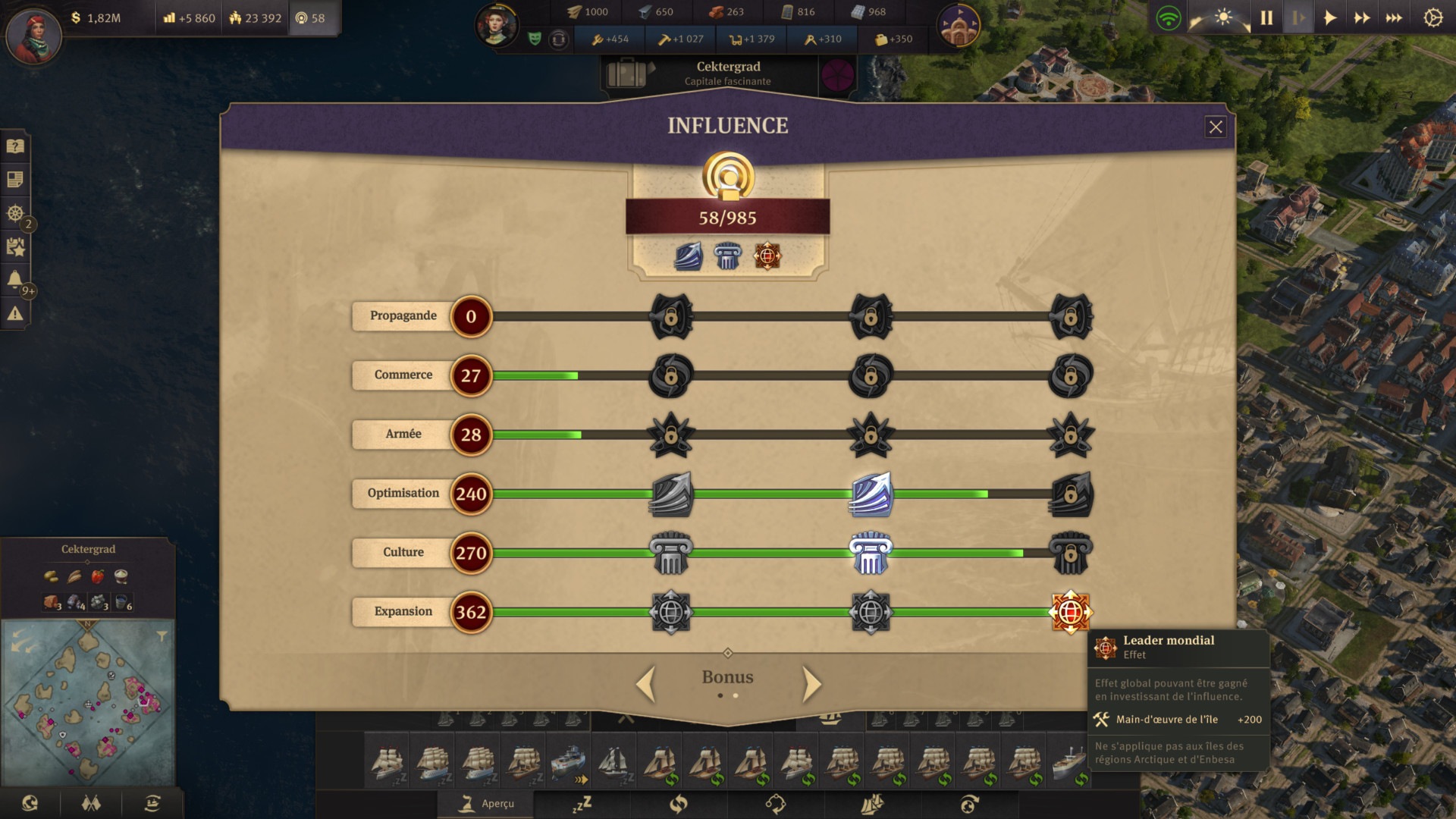 L’influence est générée par 2 éléments dans le jeu de base, la population totale et le palier des investisseurs. Effectivement, plus vous avez de population, plus vous gagnez d’influence. Chaque amélioration d’une résidence au stade d’investisseur génère également de l’influence.