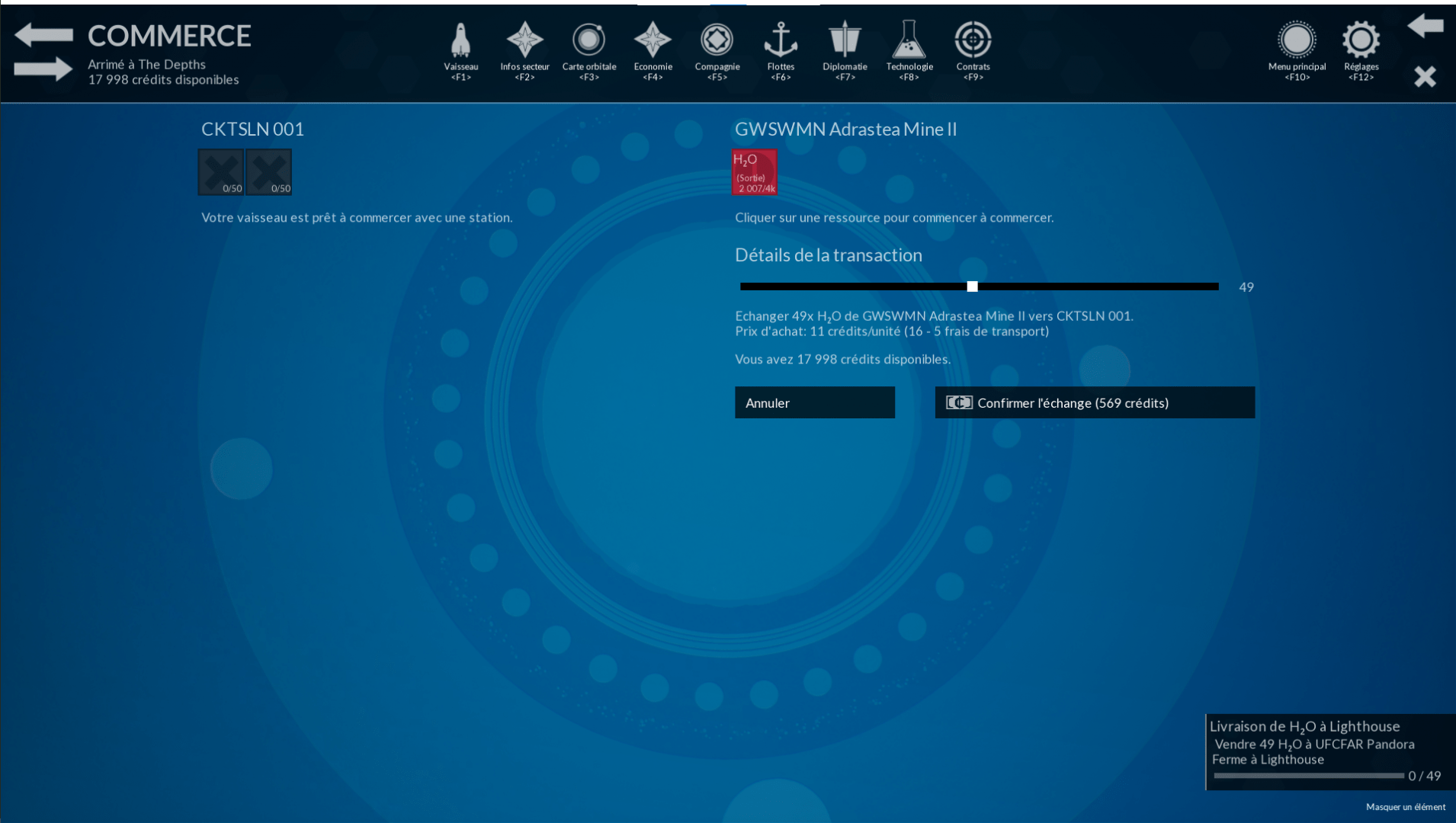Pro tips - Ne confondez pas l'eau (H2O) avec le carburant (H2/O2), vos clients seraient déçus, et vous aussi ! - Vérifiez bien que votre circuit d'achat vente est viable avec le vaisseau ou la flotte concernée. Pas besoin de prendre 4 super-tankers si c'est pour transporter 3 patates. - Ne voyagez pas à vide : ayez toujours plusieurs missions en cours, ce qui vous permet de gagner des crédits avec vos transactions mais aussi en récompense de mission. - Transportez des passagers : ils ne prennent pas de place et sont un complément de revenu efficace. En plus, ils vous feront voir du pays.