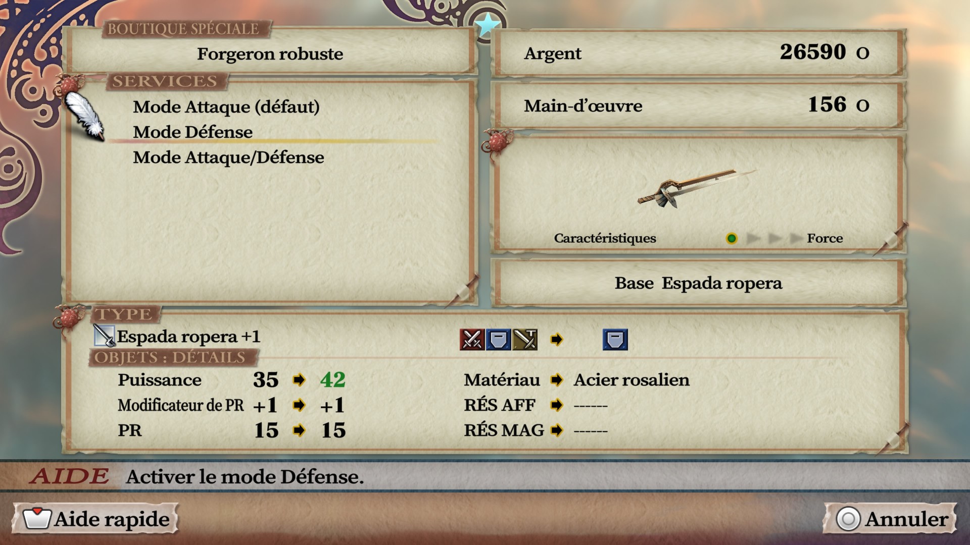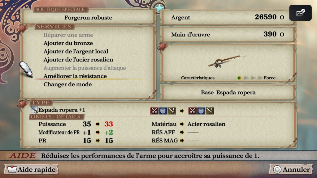 Ce qui peut vous intéresser en tant que débutant, en revanche, c’est que le forgeron vous propose de changer le mode de l’arme (attaque/défense/ruse) et son équilibre dégâts/résistance sans pour autant tremper l’arme.