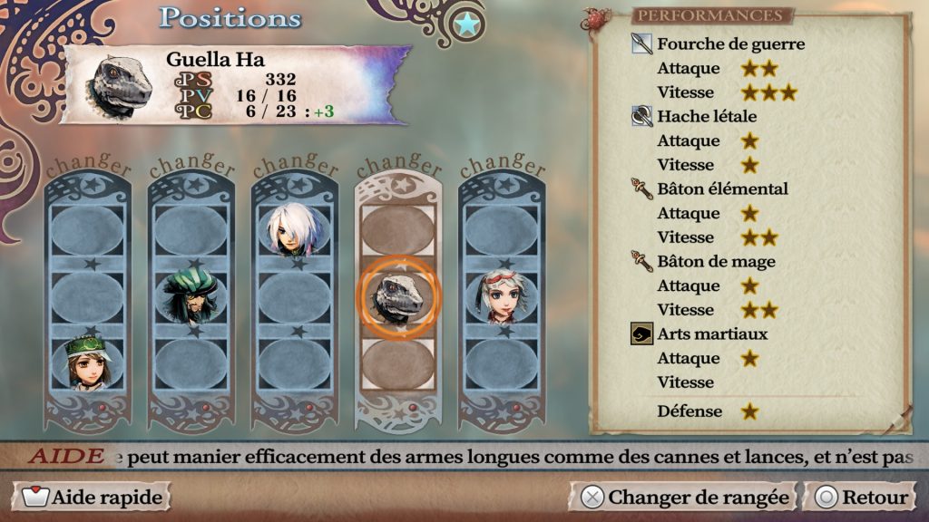 Sortez des archétypes. Jouer une arme “off-class” pendant quelques combats peut permettre de rattraper un gap dans les stats d’un personnage. Guella Ha est un super chevalier geckling, classe dont le boost du taux de contre fait du perso une arme fatale même face aux ennemis les plus puissants. Le truc c’est que sa dextérité de base ne monte pas vite et qu’utiliser surtout les arts martiaux ne fait qu’approfondir ce gap.