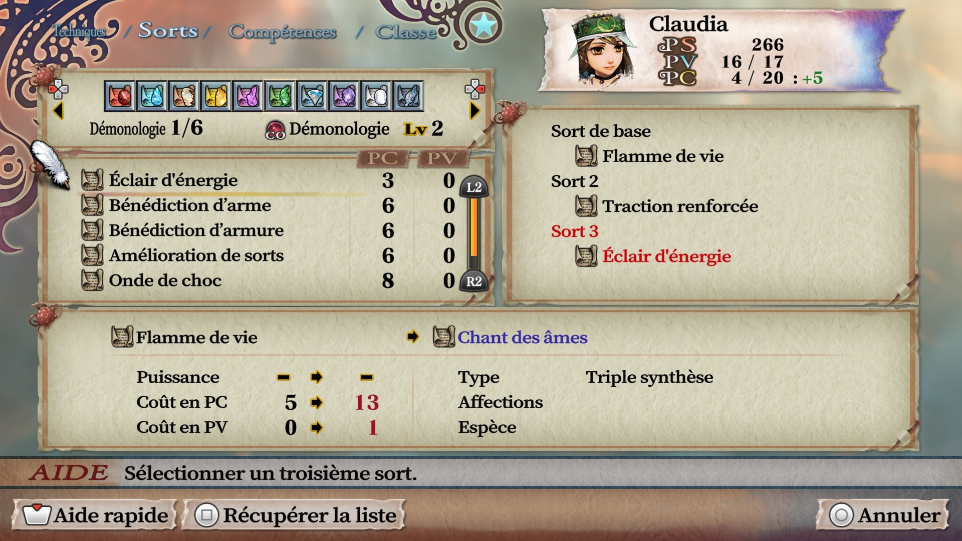 | Le Démon | Cyril +4 | Sorts | Avant, Arrière, Arrière, Avant, Milieu, Arrière, Milieu, Avant (probablement d’autres (?)) |