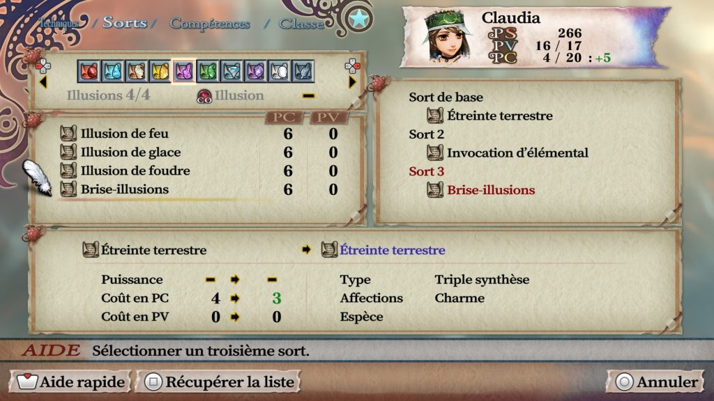Érudit Impérial : le petit frère du mage rosalien ne synthétise qu’avec 2 sorts. Il y a hélas des synthèses auxquelles il n’a pas accès, mais n’avoir besoin que de deux sorts veut aussi dire qu’il peut, plut tôt dans le jeu, synthétiser certains sorts complexes.